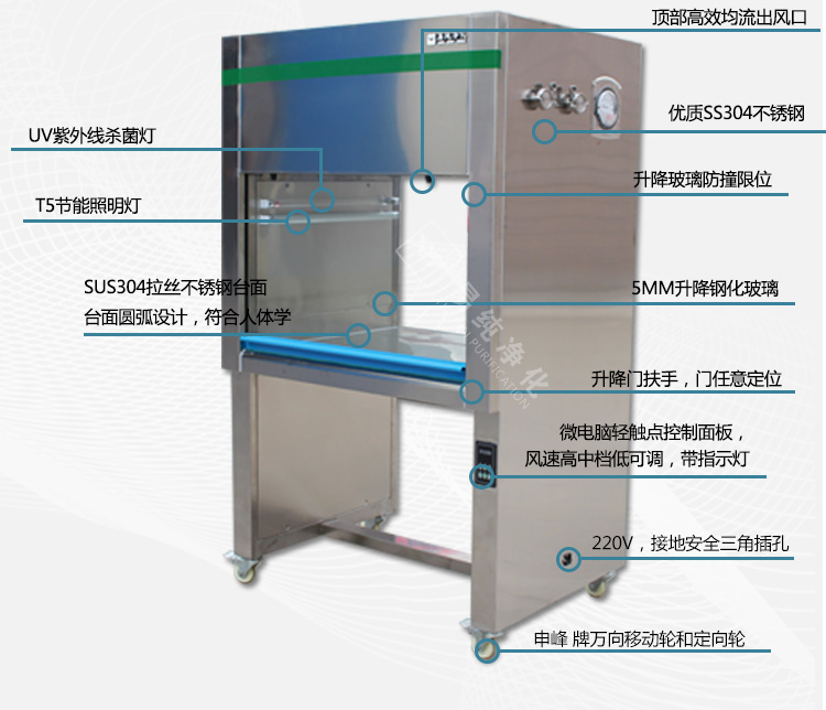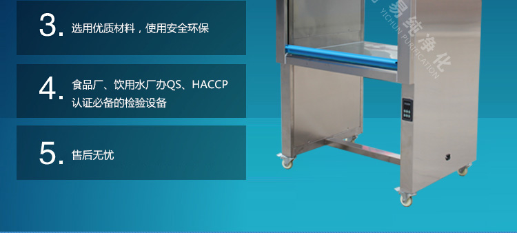 安全可靠的保障措施: 嚴(yán)格按照國際電氣安全標(biāo)準(zhǔn)規(guī)范設(shè)計(jì),確保產(chǎn)品具有多重安全保護(hù)措施,采用柔光型的照明燈與紫外線殺菌燈控制單獨(dú)控制,同時(shí)需要注意的是紫外線殺菌只能在工作前開殺菌,在人工作時(shí)不允許開紫外線殺菌燈,避免紫外線殺菌燈對(duì)人體皮膚造成灼傷。